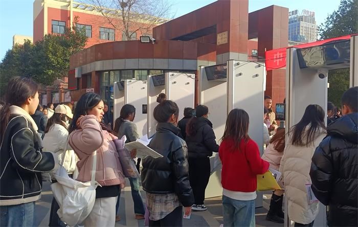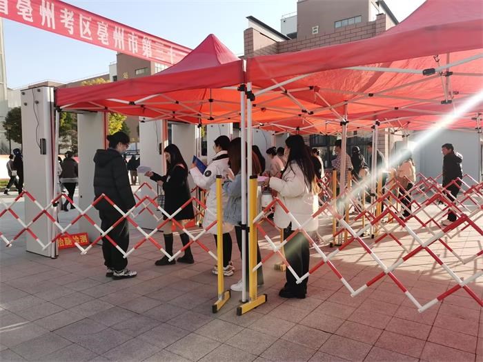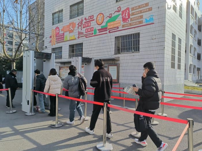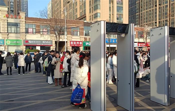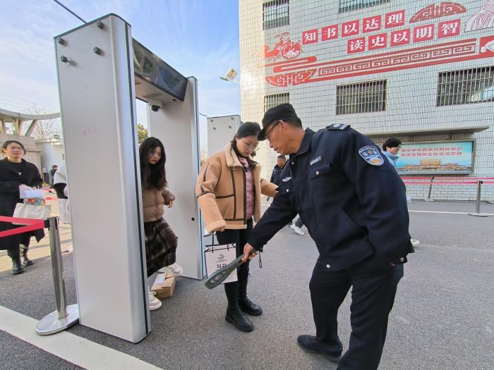 在工作人员和安保人员的引导下,考生持准考证和身份证依次有序进入考点。进入考场前,考生还要再次接受考试违禁物品检查。每个考场都配备了手持金属探测仪,工作人员会对每一位考生进行全面安检,严格落实考生抬脚亮鞋底的安检动作。
