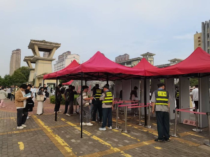 当日一大早,广大考生便从各地赶到考点,在大门外排队等候进场。入场时间一到,各考点通道按时开启。考生在工作人员的引导下,凭有效身份证和准考证,接受智能安检门安检后进入考点。