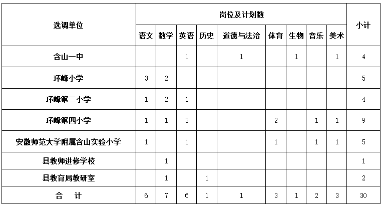 含山一中、教师进修学校、环峰小学、环峰第二小学、环峰第四小学、安徽师范大学附属含山实验小学拟选调教师28名;县教育局拟选调教研员2名(具体岗位、学科见附件1)。