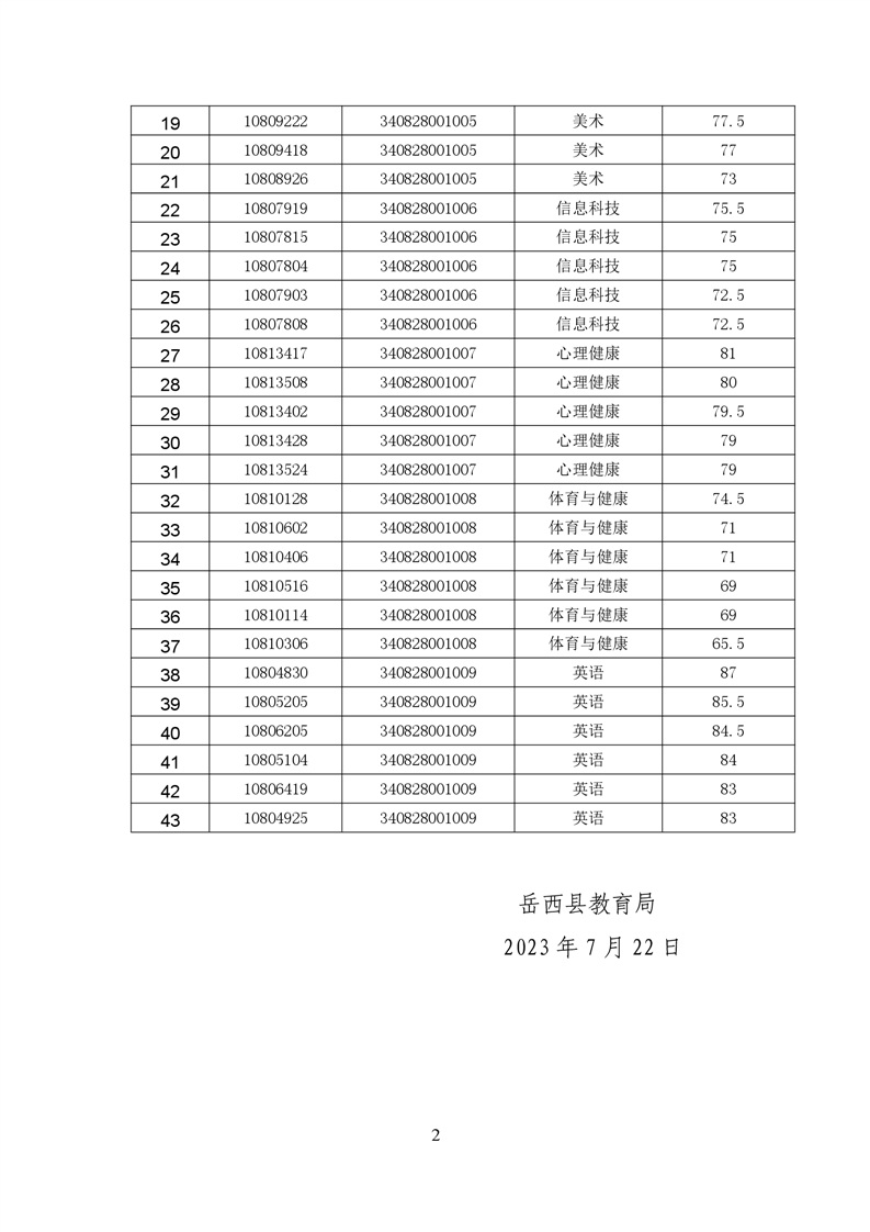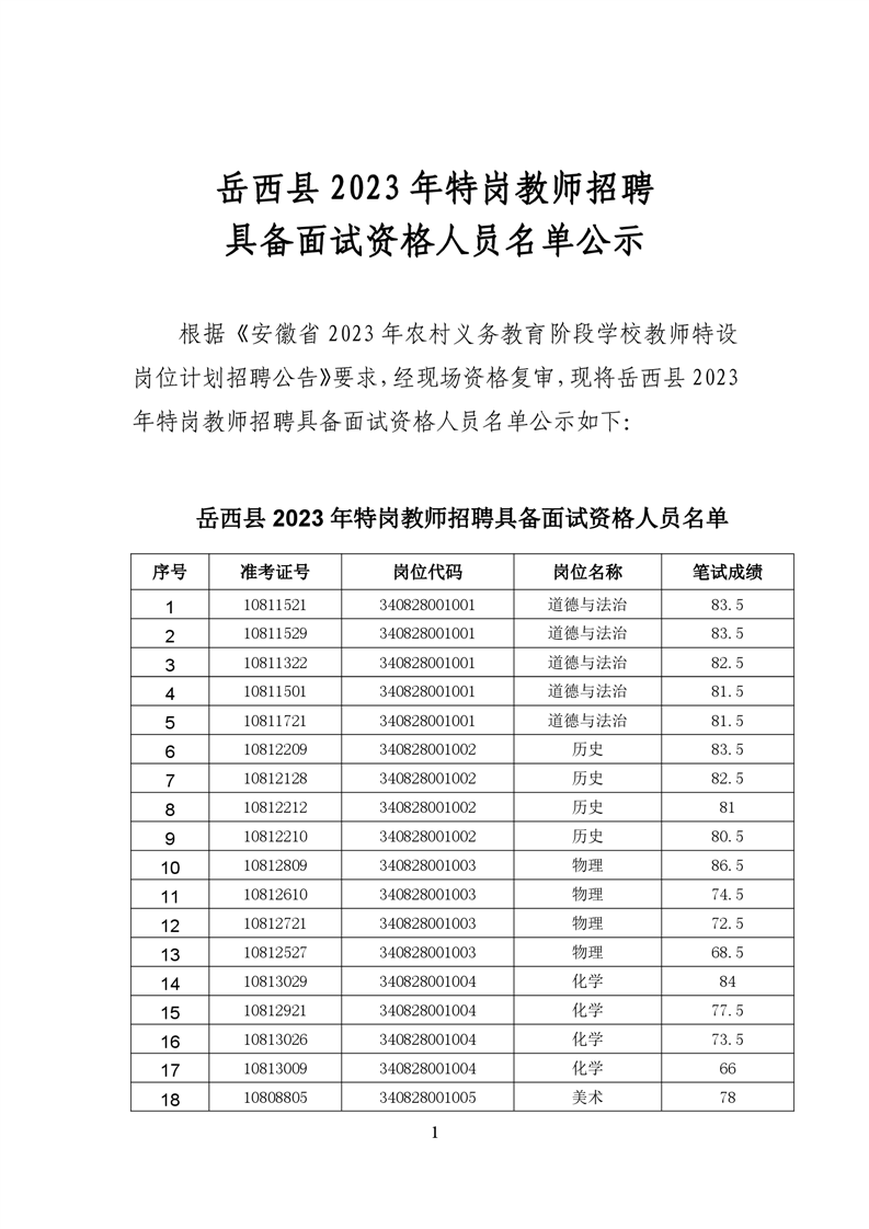 岳西县2023年特岗教师招聘具备面试资格人员名单公示