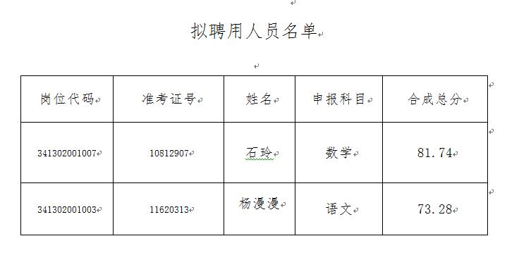 根据《安徽省2020年农村义务教育阶段学校教师特设岗位计划招聘公告》《安徽省2020年特岗教师招聘空缺计划再次征集志愿公告》等规定,经报名、现场资格复审、面试、体检考察等招聘程序,现将2020年宿州市埇桥区特岗教师招聘空缺计划再次征集志愿拟聘用人员进行公示(名单见附件)。